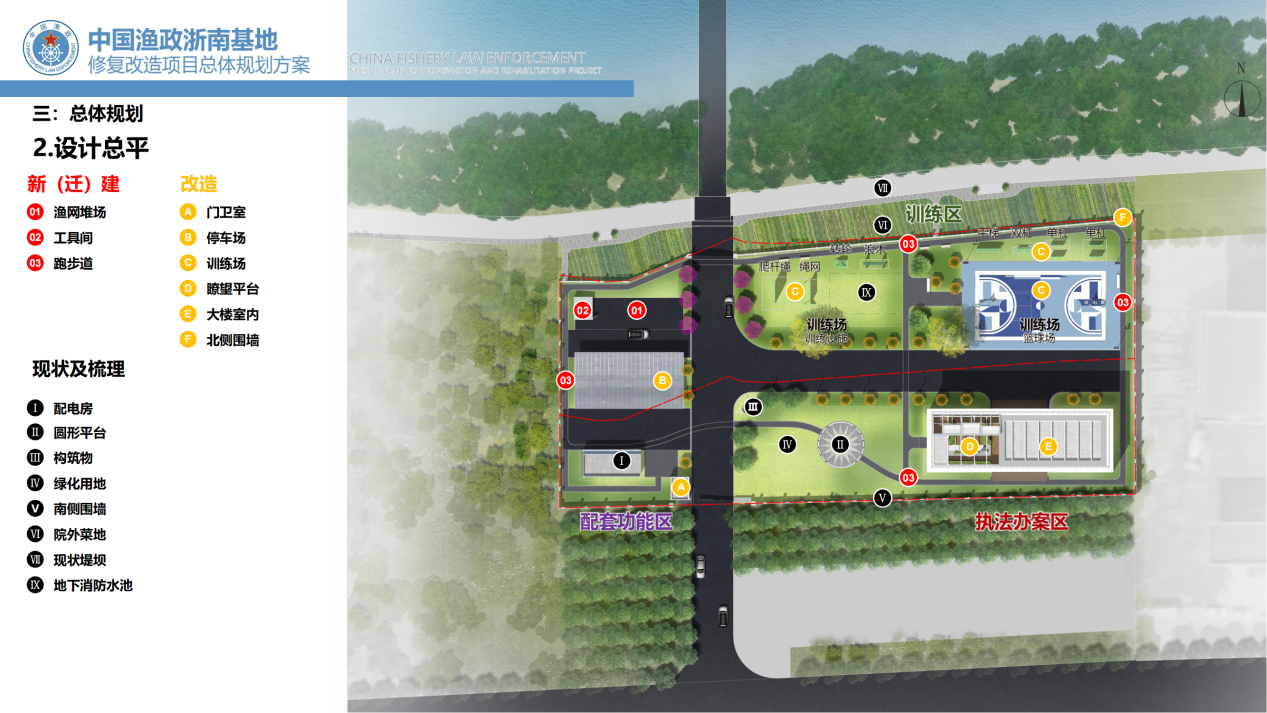 該項(xiàng)目位于溫州海洋經(jīng)濟(jì)發(fā)展示范區(qū)(靈昆島),工程建設(shè)用地3230平方米,總建筑面積1642平方米,其中漁政管理用房1559平方米,配電房63平方米,門衛(wèi)室20平方米,總投資約550萬元。項(xiàng)目通過完善基地配套基礎(chǔ)設(shè)施,解決基地年久失修、地基沉降、功能不全等問題,同時改善大院空間布局,滿足基地人員辦公、訓(xùn)練、執(zhí)法辦案、船艇靠泊等需求,提升基地在維護(hù)浙南漁場秩序,加強(qiáng)漁船安全管理的綜合保障能力,從而更好地適應(yīng)海洋與漁業(yè)執(zhí)法的新形勢新要求。